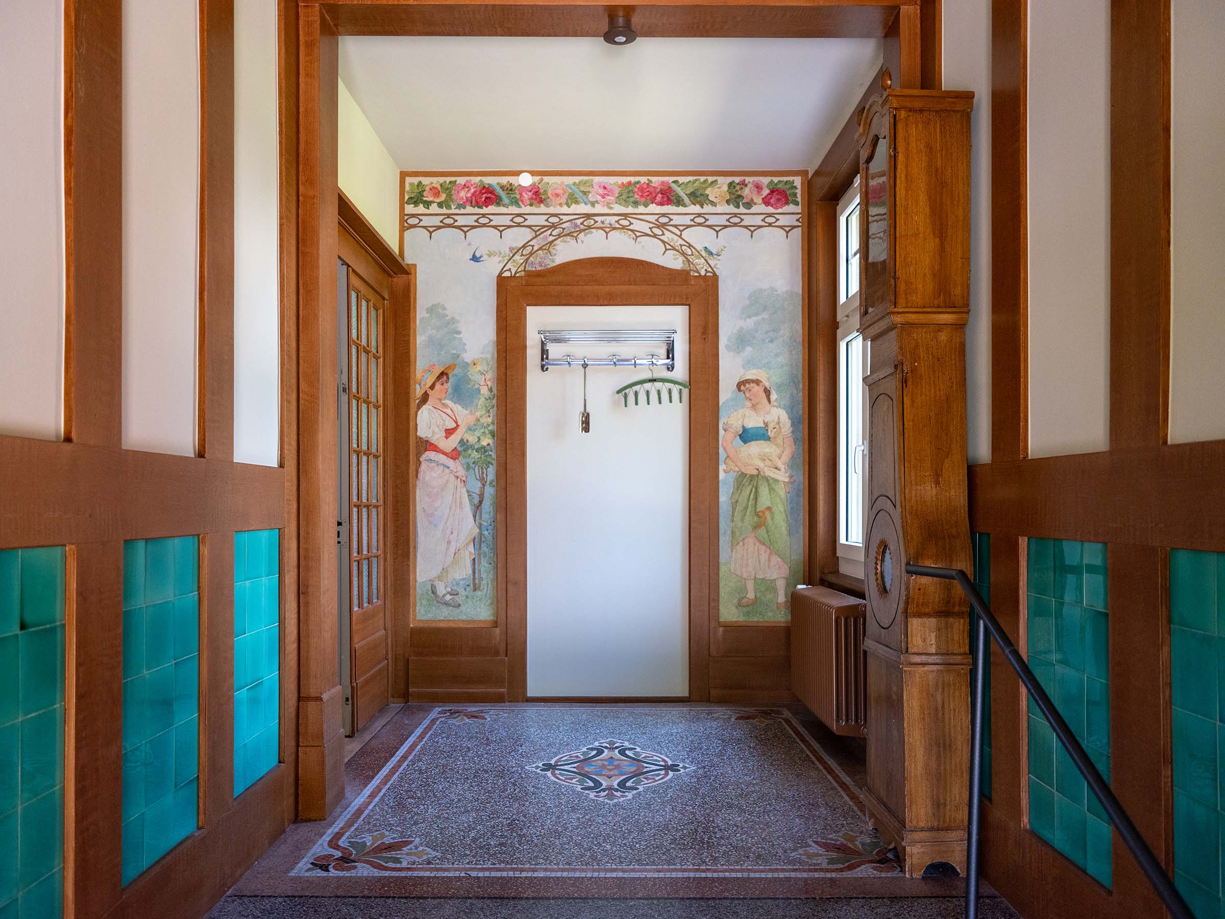Eingangsbereich mit grünen Fliesen und gemalter Idylle (Foto: Pawlik + Wiedmer GmbH).Ins – Eingangsbereich als Visitenkarte