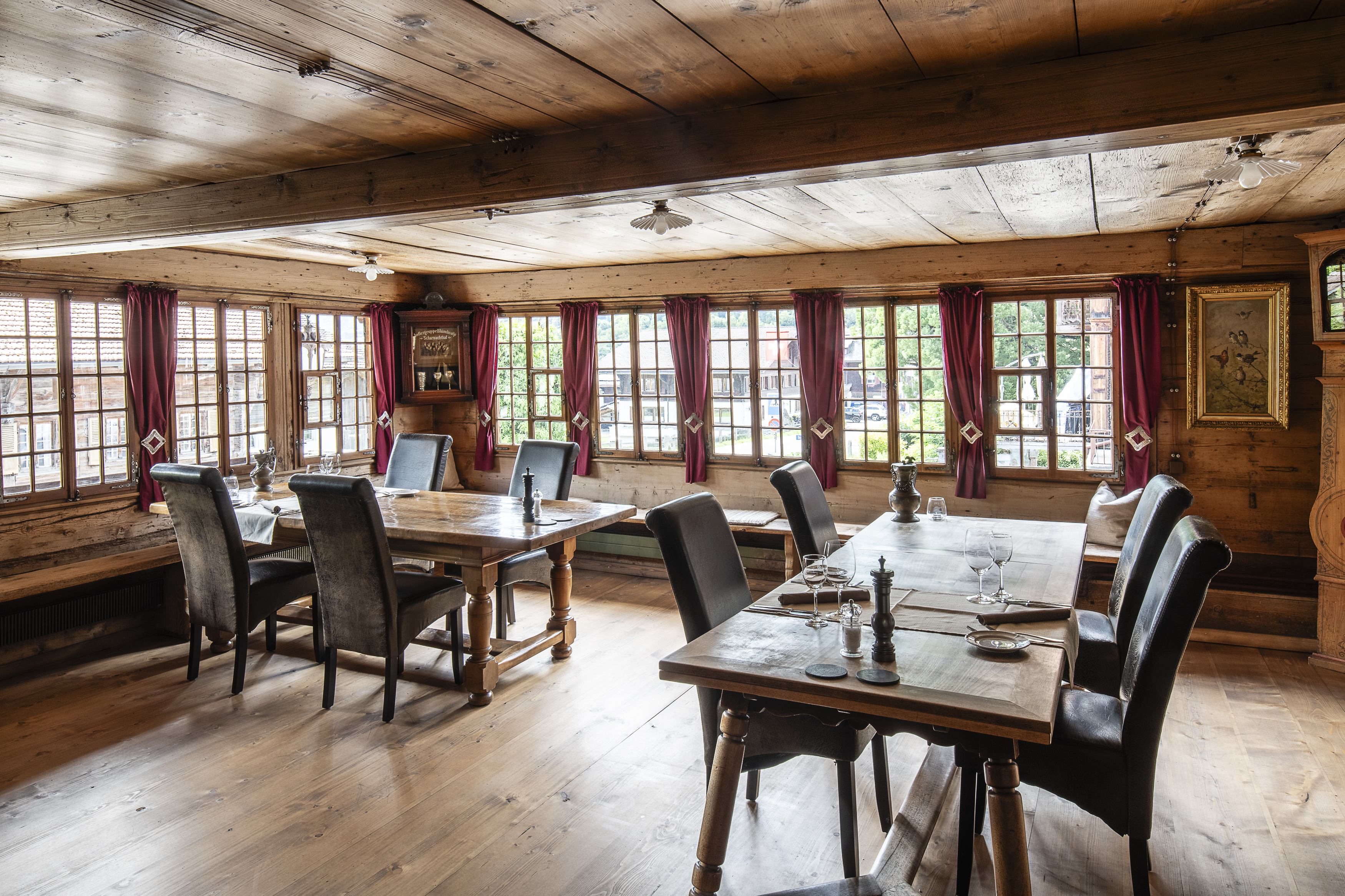 Dans l’ancienne salle du restaurant, dont les boiseries du début du 20e siècle ont été soigneusement restaurées, a été installée la cuisine (photo : Dominique Plüss).Corcelles – Eine behutsame Restaurierung