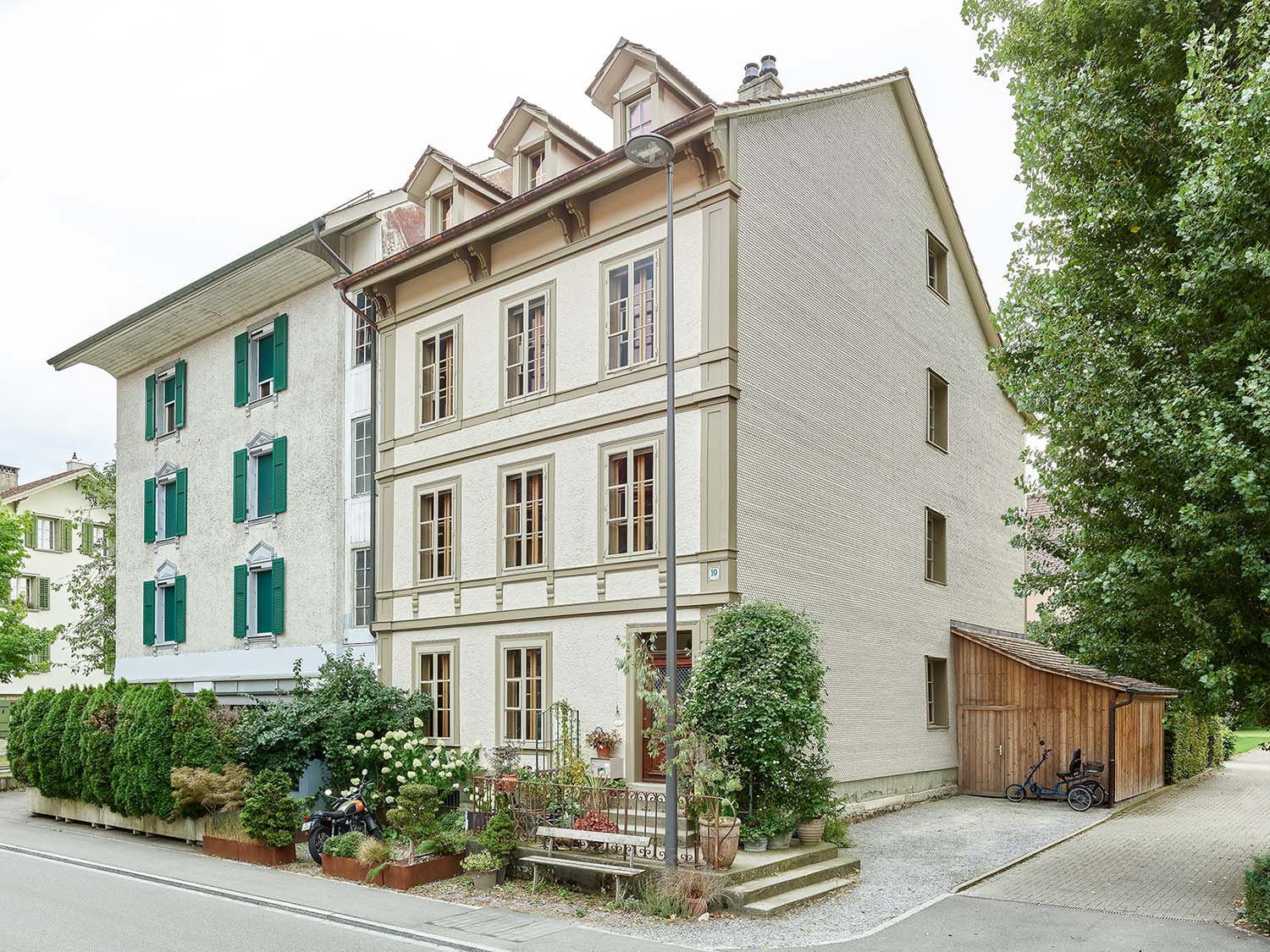Avec sa maçonnerie fraîchement crépie, ses tavillons réparés et repeints ainsi que ses fenêtres restaurées, l’immeuble locatif de style néo-classique tardif à Berthoud retrouve toute sa fraîcheur et son authenticité (photo : Roland Juker).Burgdorf – Gehegt und gepflegt