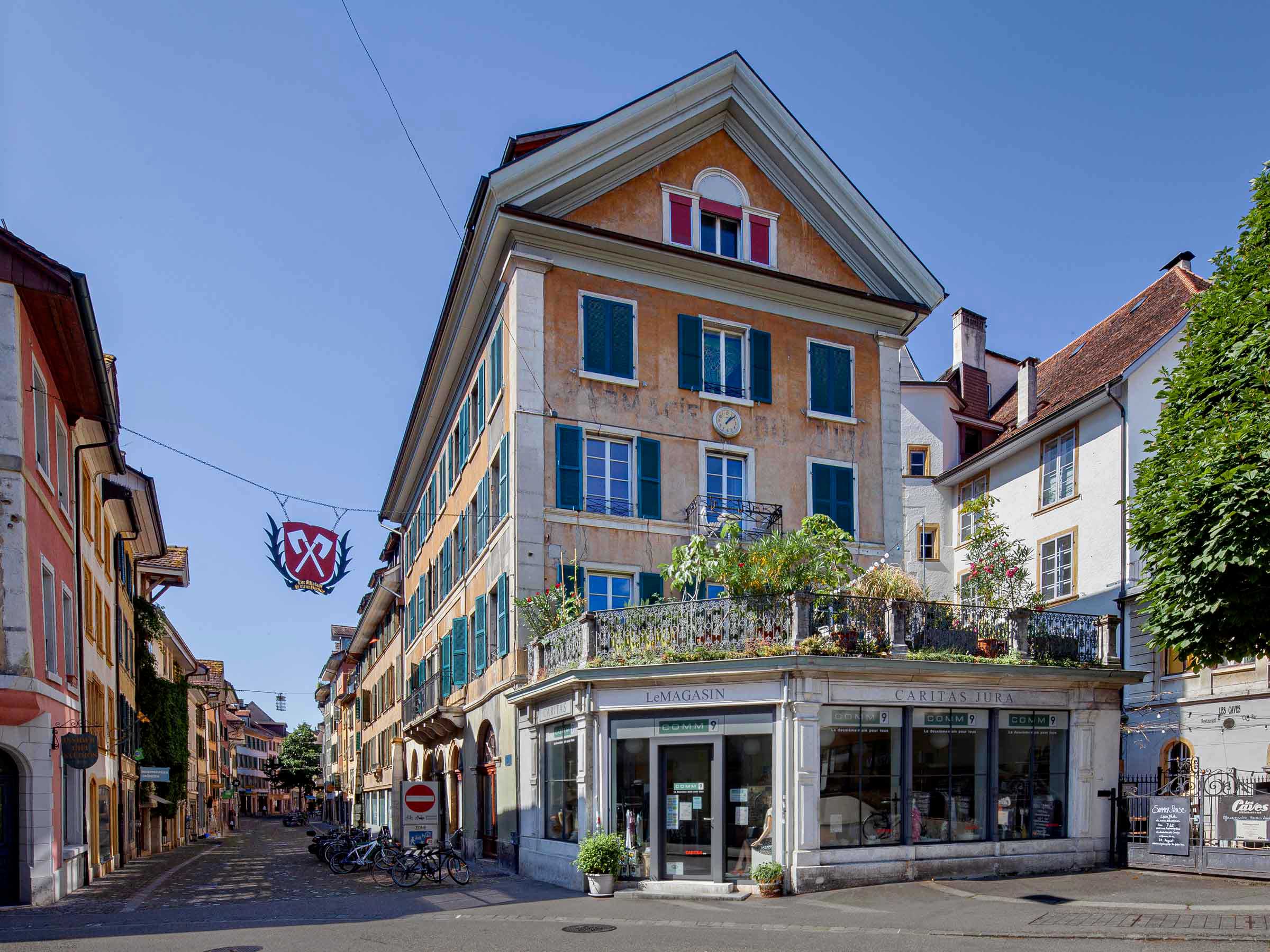 Das Gebäude am Juraplatz markiert den Zugang zur unteren Altstadt. Der ehemalige Gasthof verfügte bis 1874 über eine Postkutschenstation. Um 1860 kam ein Ladenvorbau dazu, der später erneuert wurde. Im Jahr 1893 folgte ein markanter Terrassenaufbau. Heute wird das stattliche Gebäude als Wohn- und Geschäftshaus genutzt. Der Kopfbau im Stil des Spätklassizismus besticht durch seine klar gegliederten Fassaden mit Ecklisenen. Sie prägen das Erscheinungsbild der unteren Altstadt wesentlich und sind architektonisch und kunsthistorisch von grosser Bedeutung. Zur Untergasse hin betont ein grosser Balkon mit schlichtem Biedermeiergitter die Mittelpartie. Charakteristisch sind die Rundbogenfenster und -türen mit dekorativen Sprossen im Erdgeschoss. Zum Juraplatz hin sticht das kunstvoll gearbeitete Terrassengitter über dem Ladenvorbau ins Auge. Ein schöner Hof in Richtung Obergasse rundet die Anlage ab.