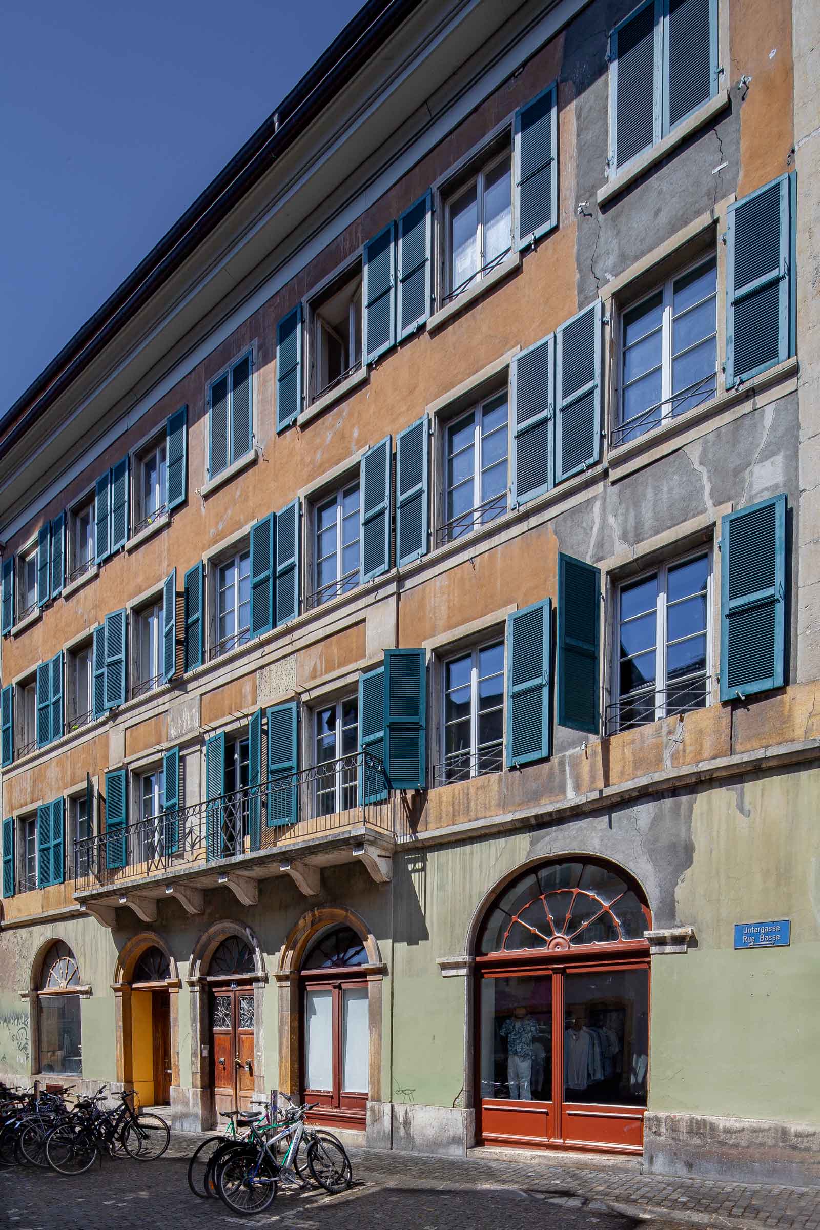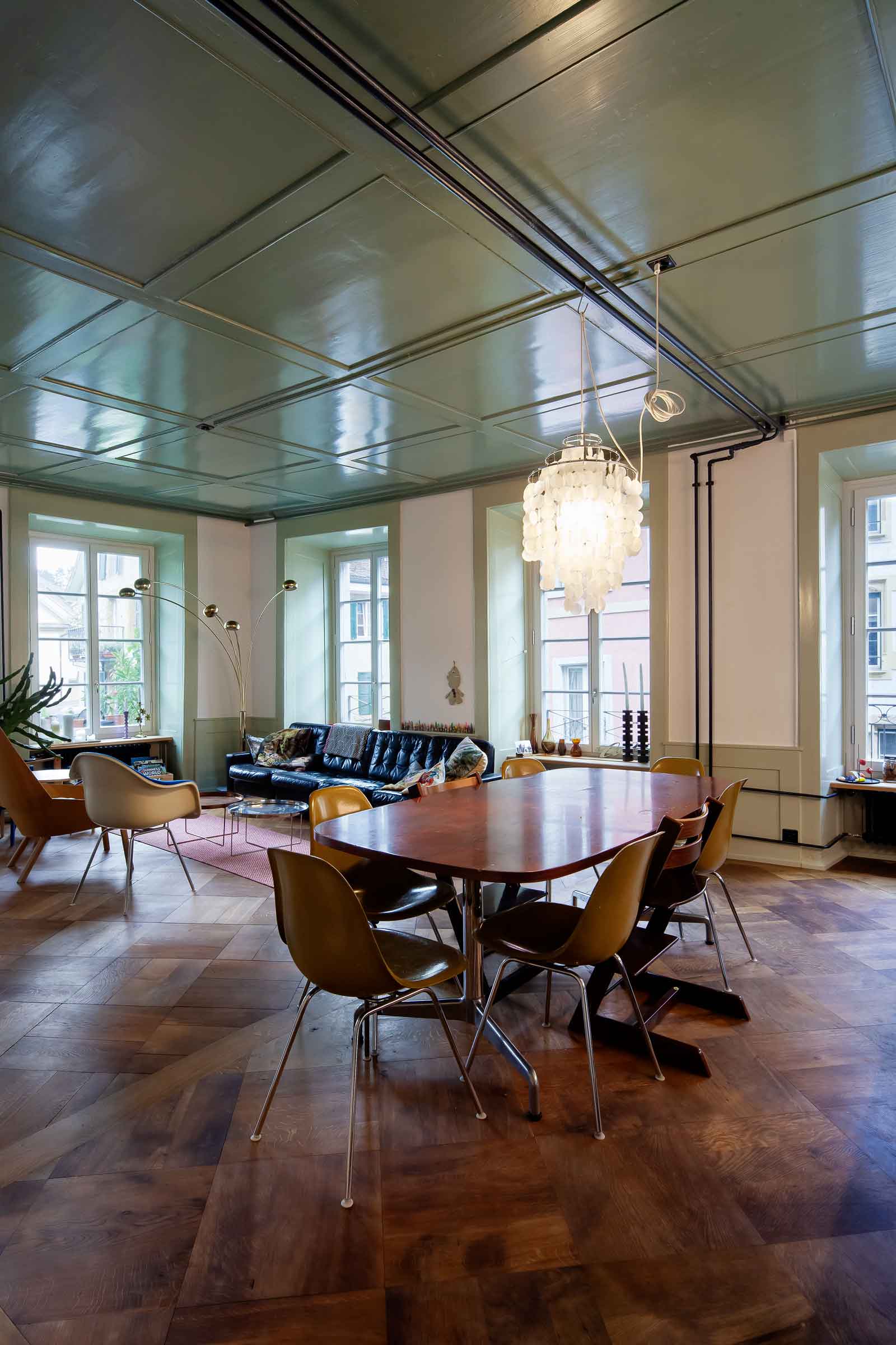 Das Mietwohnhaus am Juraplatz hat eine spannende Geschichte. Bei der Sanierung der Wohnungen entdeckte man, dass sich die grosse Felderdecke im Obergeschoss sogar über mehrere Räume erstreckt: Sie gehört wohl zu einem Saal aus der Bauzeit des Hotels.