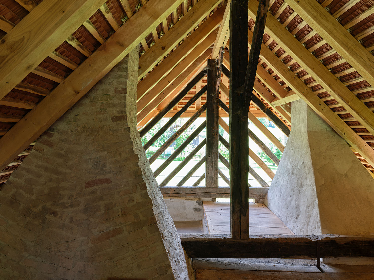Die parallel zu den Sparren liegenden Holzstreben in den Giebeldreiecken dienen als Rauchöffnungen (Foto: Bahoz Issa),