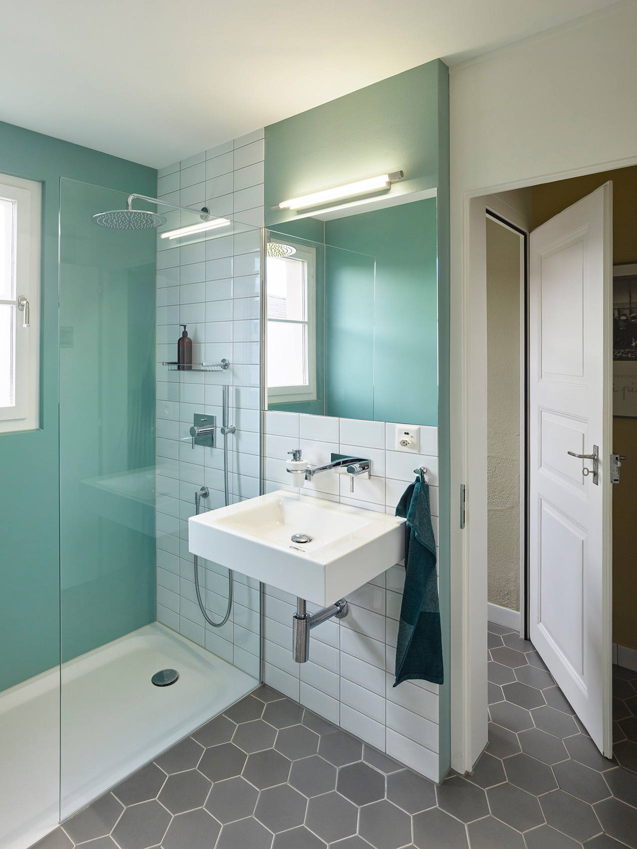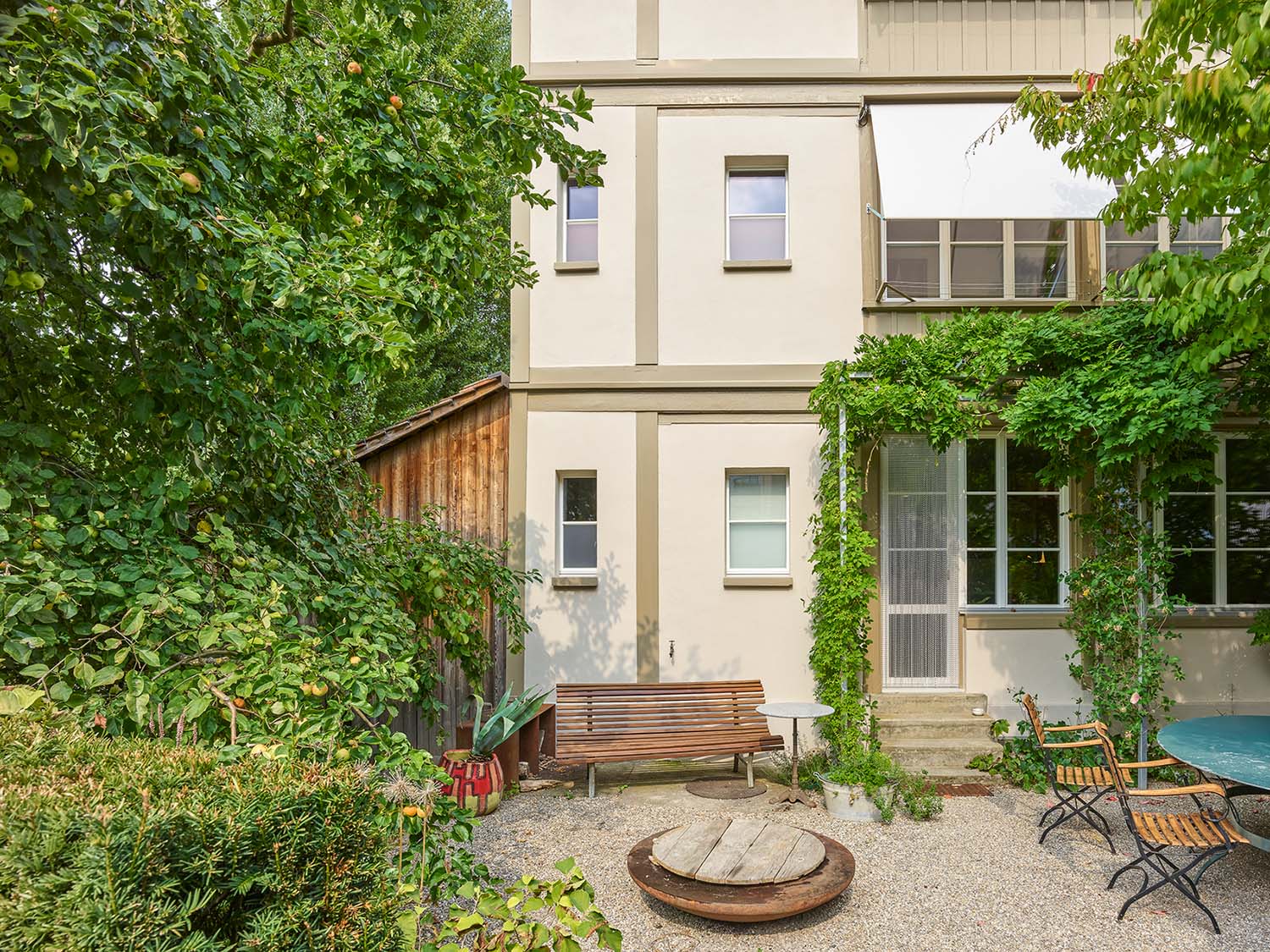 Die harmonische Erscheinung des einstigen Mehrfamilienhauses ist das Verdienst einer umsichtigen Pflege der Gebäudehülle und des Dachs. Sie ist aber auch das Ergebnis guter Zusammenarbeit zwischen der Eigentümerschaft und den Handwerkerinnen und Handwerkern. Gemeinsam wurde sorgfältig geprüft, was erhalten werden konnte und was ersetzt werden musste. So wurden Mauer- und Riegwerk der Strassen- und Gartenfassade Nord und Süd neu verputzt und gestrichen. Den Rundschindelrand an der Westfassade reparierte man und strich ihn mit passender Ölfarbe. Auch Fenster und Holzelemente wurden fachgerecht restauriert, fehlende Gläser ergänzt und das Dach mit nötigen Spenglerarbeiten instandgesetzt – inklusive Entfernung der alten Asbestplatten. In der letzten Umbauphase erfolgte nun noch die sorgfältige Renovation des Dusch- und Badbereichs. Dabei konnten historische Feinsteinzeug-Bodenplatten aus dem Bauteilelager der Denkmalpflege wiederverwendet werden.