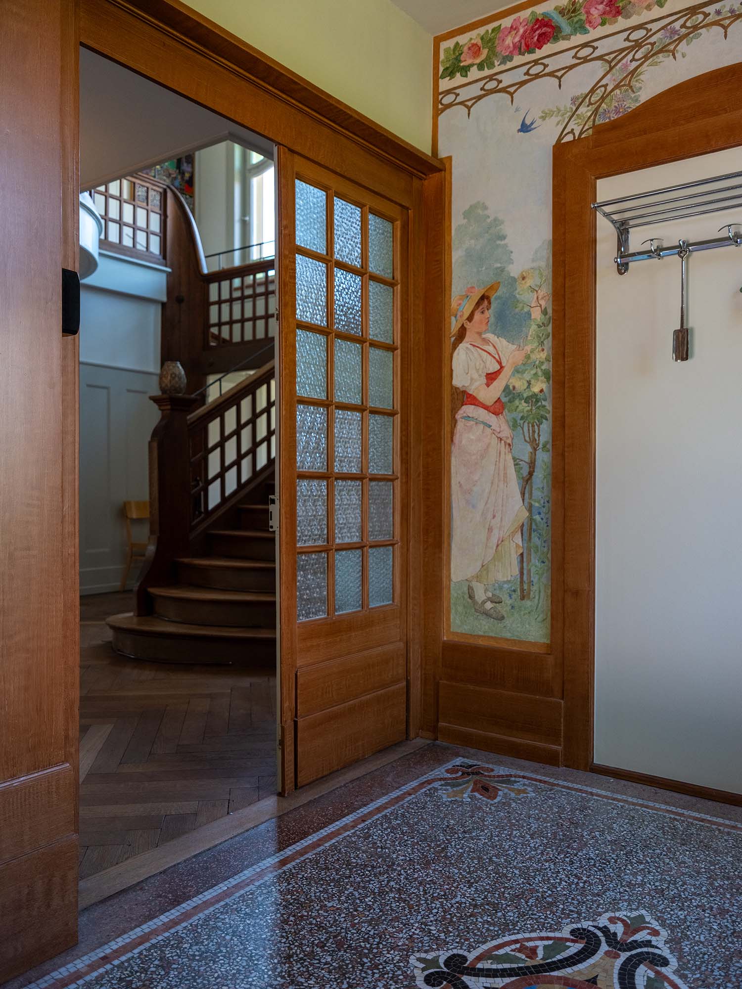 Überraschendes trat an den Wandflächen im Inneren zu Tage. Im Flur und in der Treppenhalle fanden sich Reste von mindestens zwei Gestaltungsphasen, die kurz hintereinander entstanden sein müssen. Der grosszügige Eingangsbereich des Hauses sollte als Visitenkarte mit unterschiedlichen Materialien und Farben beeindrucken. Der mehrfarbige Terrazzoboden, der im erhöhten Bereich ein teppichartiges Muster zeigt, blieb unverändert erhalten. An den Wänden prägen grüne Fliesen den Sockelbereich, darüber harmonierten ursprünglich terrakottafarbene Putzflächen mit der gemalten Maserierung der Holzelemente.