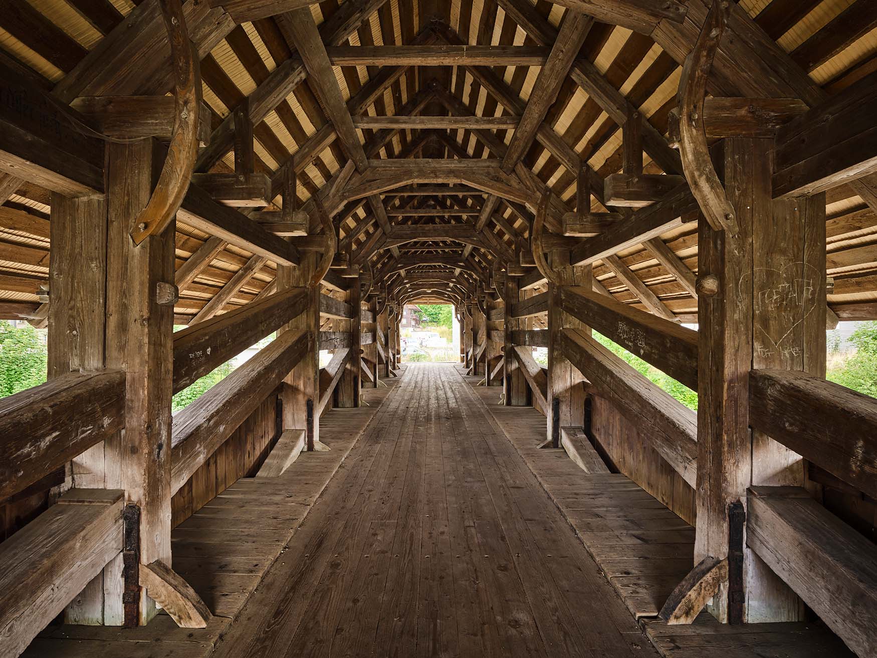 Die Brücke ist als doppeltes Hängewerk unter einem Halbwalmdach konstruiert. Ihre Holzbalken sind auffallend kräftig dimensioniert, während die lichtdurchlässigen Öffnungen der Quergebinde rokokohaft verspielt wirken. Besonders auffällig ist das Schindeldach. Es wurde mit Schindeln aus Eggiwil neu eingedeckt – mit handwerklichem Können und Respekt vor der Tradition. Als zweitälteste Brücke Langnaus hat das Bauwerk grosse typologische und bauhistorische Bedeutung. Ihr sorgfältiger Unterhalt ist ein sichtbares Zeichen für die Verbundenheit der Gemeinschaft mit dem Bauwerk und zeugt von ihrer grossen Bedeutung für die Identität der Region.