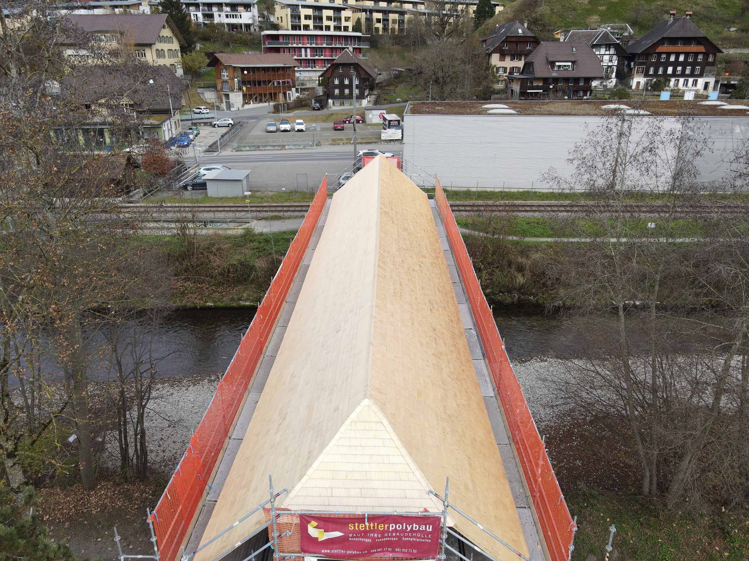Die Moosbrücke in Langnau verbindet nicht nur Ortsteile. Mit Schindeln aus Eggiwil neu eingedeckt, ist sie auch ein sichtbares Zeichen regionaler Verbundenheit.