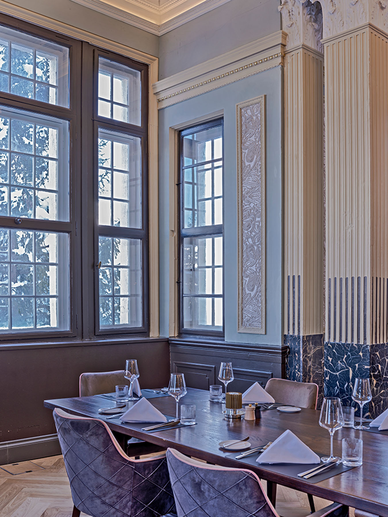 Die Freilegung der Farb- und Putzschichten brachte das ursprüngliche Dekor der Wände zum Vorschein. Als Inspiration hatten offensichtlich die Bände «Dekorative Vorbilder» gedient, die um 1900 im Verlag Julius Hoffmann, Stuttgart, erschienen waren. Auch die Apsis des Speisesaals erhielt ihr ursprüngliches Dekor zurück. Holzvertäfelungen, Wandbespannungen und Möbel wurden behutsam gereinigt und restauriert, moderne Technik – etwa Brandschutztüren – diskret integriert. In der Empfangshalle restaurierte man den Kamin und das Treppenhaus. Einer der Salons, vermutlich ehemals der Damensalon, beherbergt heute eine Bar in Jugendstil-Gestaltung. Alle Aufenthaltsbereiche im Erdgeschoss wurden mit zeitgenössischem Mobiliar ausgestattet.