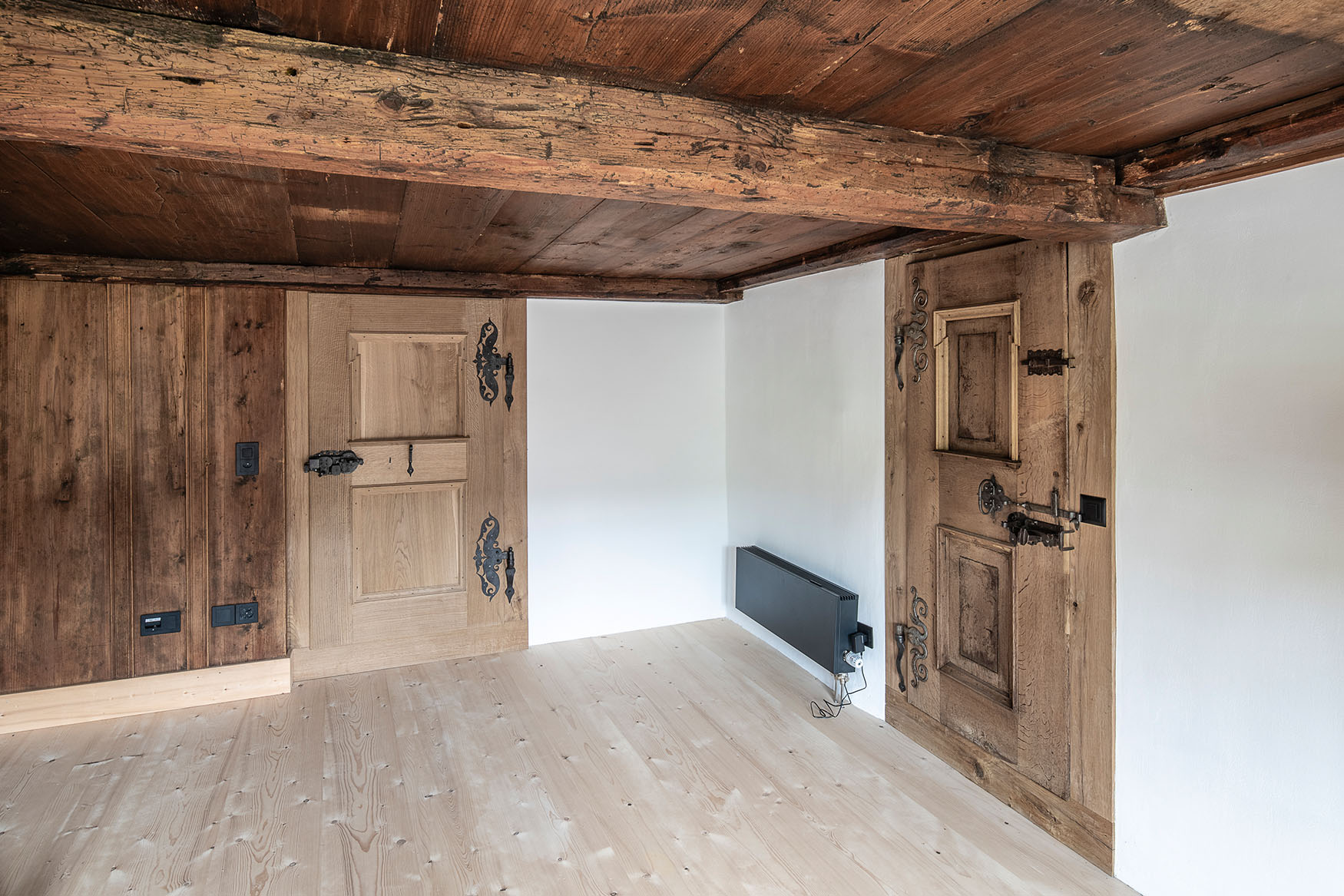 Wo immer möglich, wurde die historische Bausubstanz erhalten und sichtbar gelassen. Die ergänzten Wandverkleidungen bilden mit ihren glatten Holzoberflächen einen spannenden Kontrast zu den älteren Bauteilen mit dekorierten Kanten. Der grosse gemauerte Ofen in der oberen Turmstrube konnte neu aufgebaut wieder in Betrieb genommen werden. Neue Elemente wie Küche, Nassräume und Heizkörper wurden in zurückhaltendem, zeitgemässem Stil eingefügt. Dank einer Wasser-Wasser-Wärmepumpe mit Seewasser wird das Erscheinungsbild des Hauses nicht durch zusätzliche Kamine beeinträchtigt.