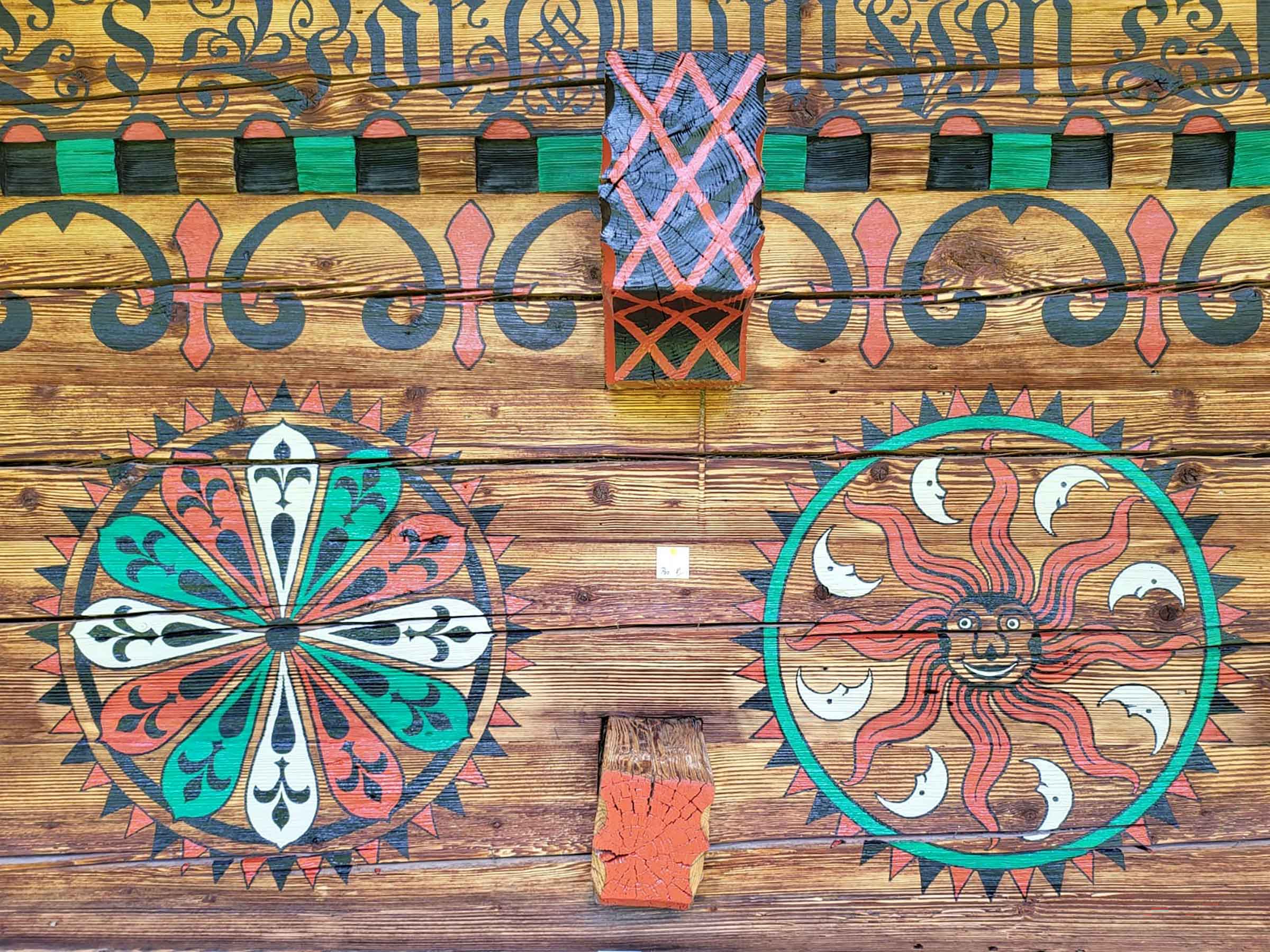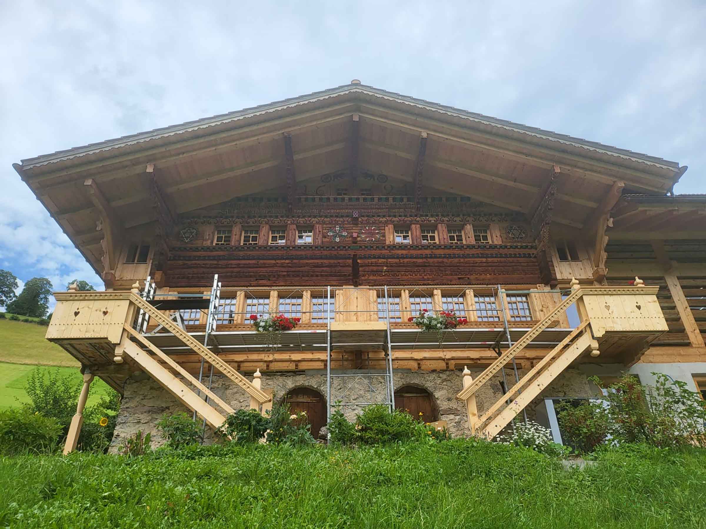 Des ornements circulaires complexes ou des rosaces, ainsi que des calices de fleurs aux formes variées, ornent la façade de la ferme (photo : Barthlome Imobersteg).