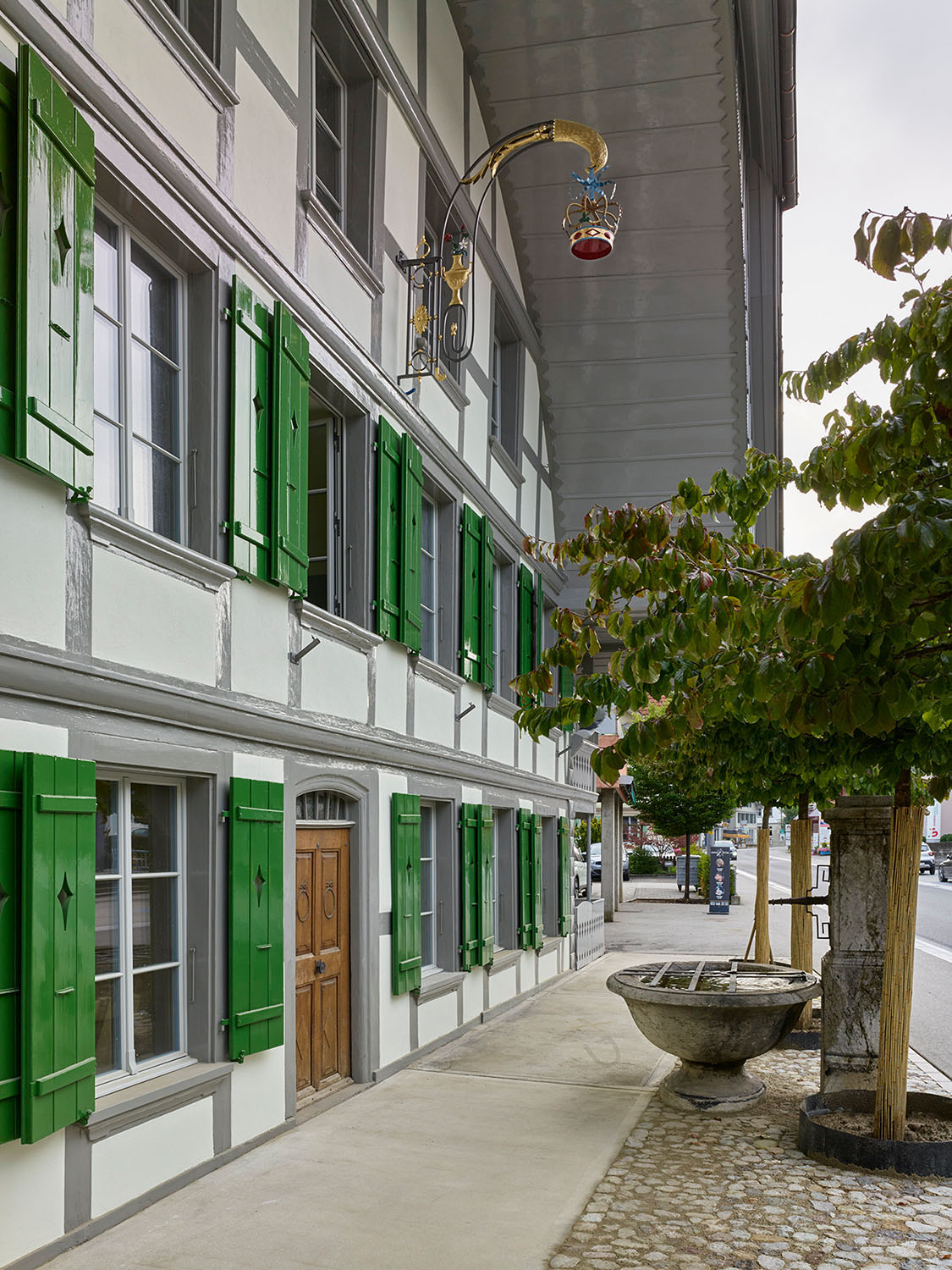 Côté Bahnhofstrasse, le bâtiment affiche aujourd’hui un extérieur gris, comme au temps de sa première transformation. Le gris devait donner une touche noble et créer l’illusion d’une construction en pierre de taille. Sur la façade nord, la structure de bois peint en brun rouge, datant probablement du début du 20e siècle, a été rénovée.