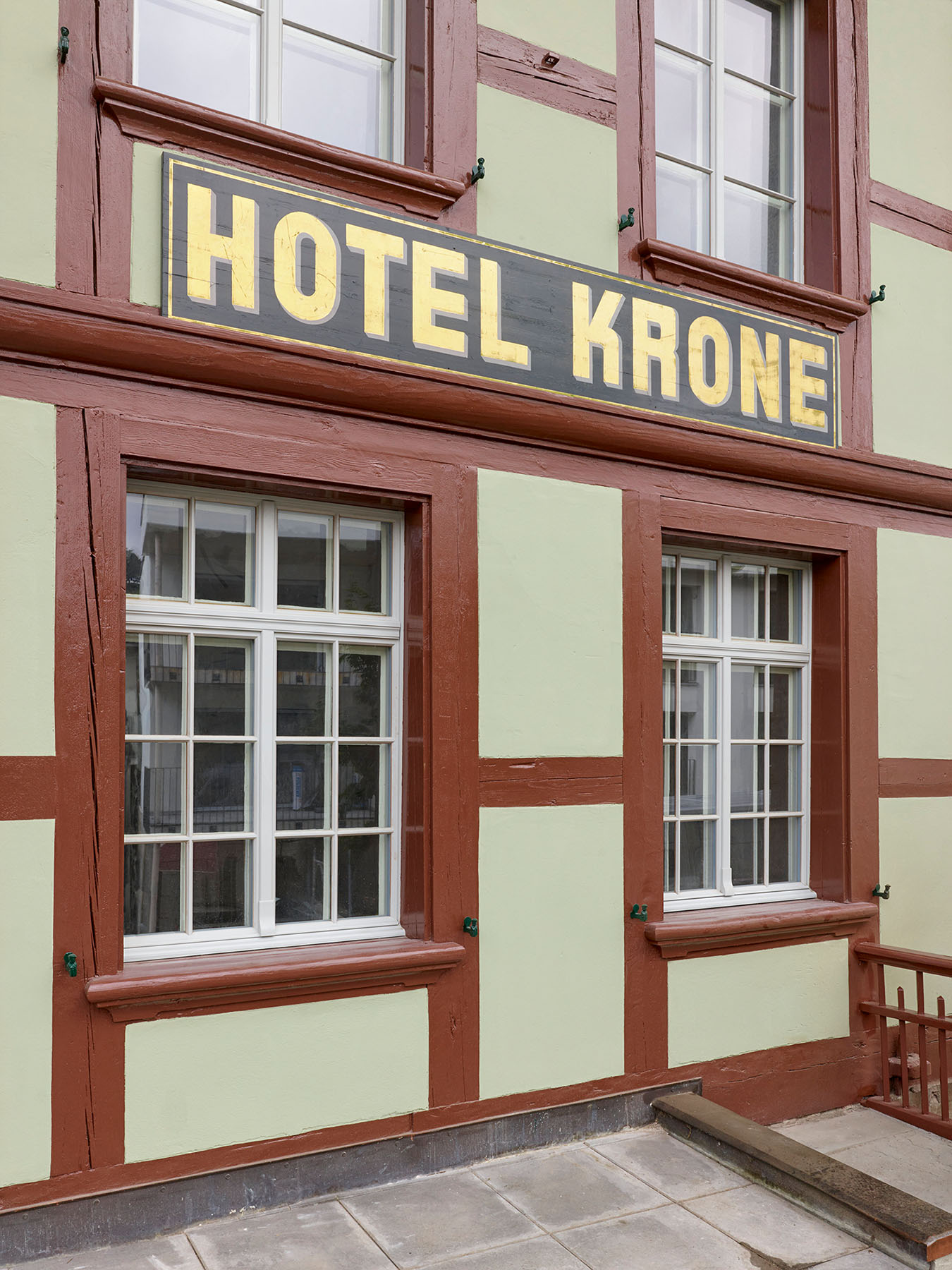 Construite vers 1750, cette maison à colombage a d’abord été une habitation paysanne cossue. Une petite annexe y a été ajoutée pour des bains publics. L’auberge de la Couronne s’y est installée en 1835. Lors de la transformation de 2023 à 2025, l’aménagement historique, datant de différentes époques, a été restauré avec soin.