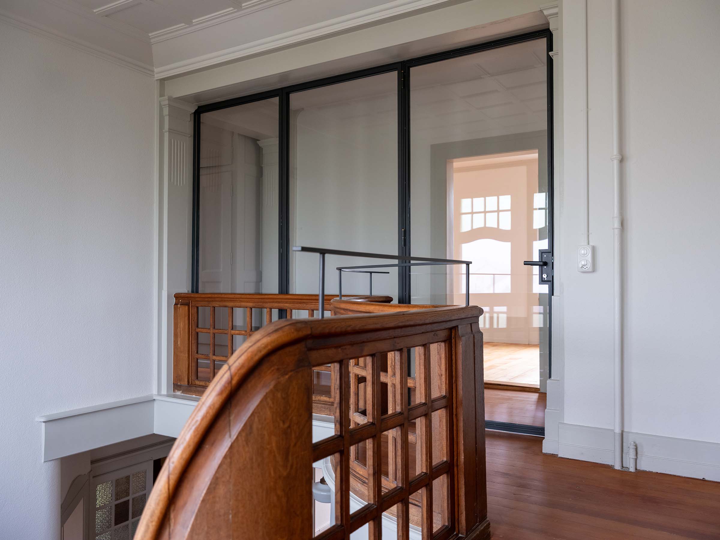 Dans le hall central, il a été décidé de ne pas dégager les peintures. Le Service des monuments historiques s’est concentré ici sur la préservation de la fenêtre triple, qui a pu être remise en état avec des verres fins isolants sous vide et conserver ses détails d’origine.