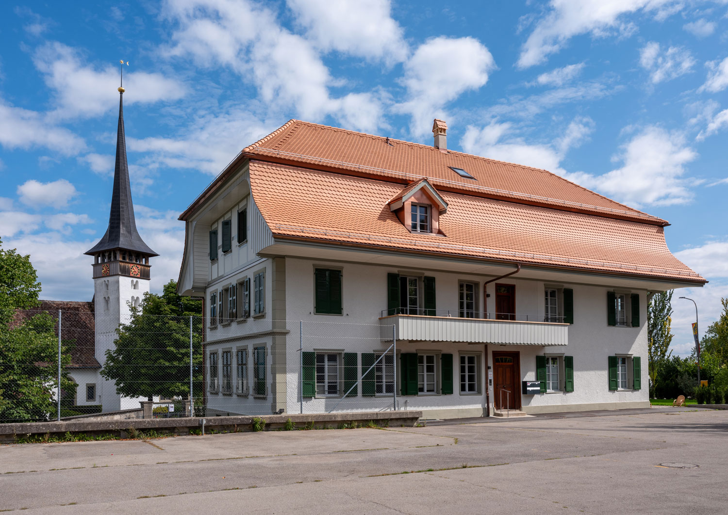 Elle est bien en évidence sur la colline de l’église. Cette ancienne école, datant de 1836, avec son toit à la Mansart typique, est en fait une construction en colombage. Elle est depuis près de deux cents ans un élément marquant du site bâti. C’est ultérieurement que l’on a enduit les murs du rez-de-chaussée et de l’étage d’un crépi grossier, et vers 1900, le bâtiment a été agrandi à l’ouest. Les portes de chêne sur les côtés longitudinaux sont d’origine. L’importance du bâtiment pour le site justifiait sa rénovation. Une entreprise menée avec soin en respectant la substance ancienne et la signification historique d’un édifice qui voit s’ouvrir devant lui un nouvel avenir.