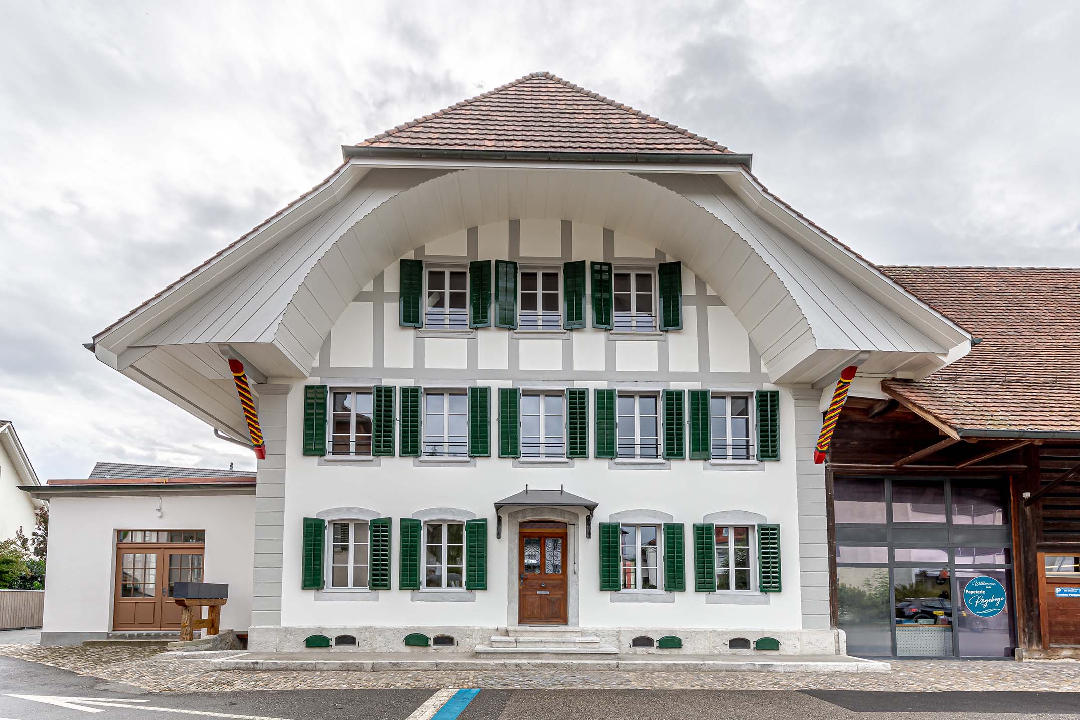 La partie d’habitation a été reprise maintenant par le couple qui possède déjà la partie rurale où il tient une imprimerie. Les époux Baumgartner se sont attelés à la tâche avec enthousiasme, menant eux-mêmes la transformation de la maison. Ils ont fait aménager à l’étage et dans le comble des appartements au charme particulier. Les surfaces ont été restaurées avec soin, et de nouvelles salles de bains et cuisines harmonieusement intégrées dans le bâti existant. Les découvertes faites sur les façades à avant-toit en berceau ont déterminé l’aspect du nouvel enduit qui y a été appliqué, tandis qu’on a enlevé une peinture plus récente sur les avant-toits.